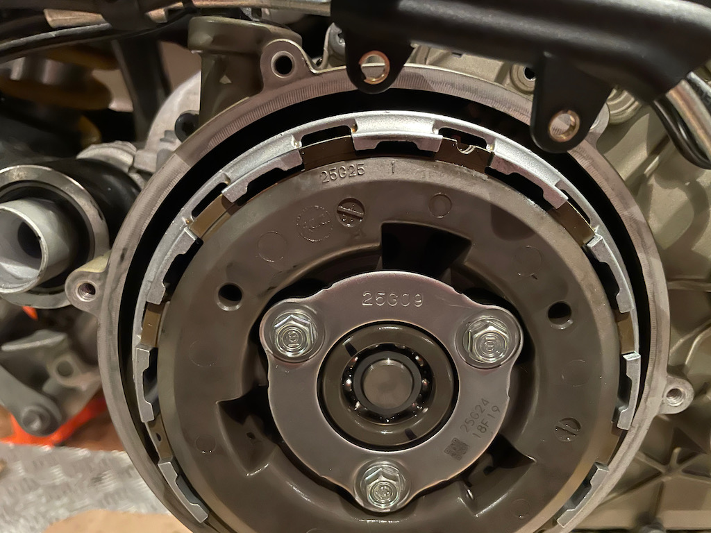 Der grosse Kupplungsdeckel ist wieder an seinem Platz. Ich nutze die Gelegenheit, statt des durchsichtigen Kupplungsdeckels wieder das Originalteil zu montieren. Die farbige Druckfeder baue ich ebenfalls aus und die Originale wieder ein.