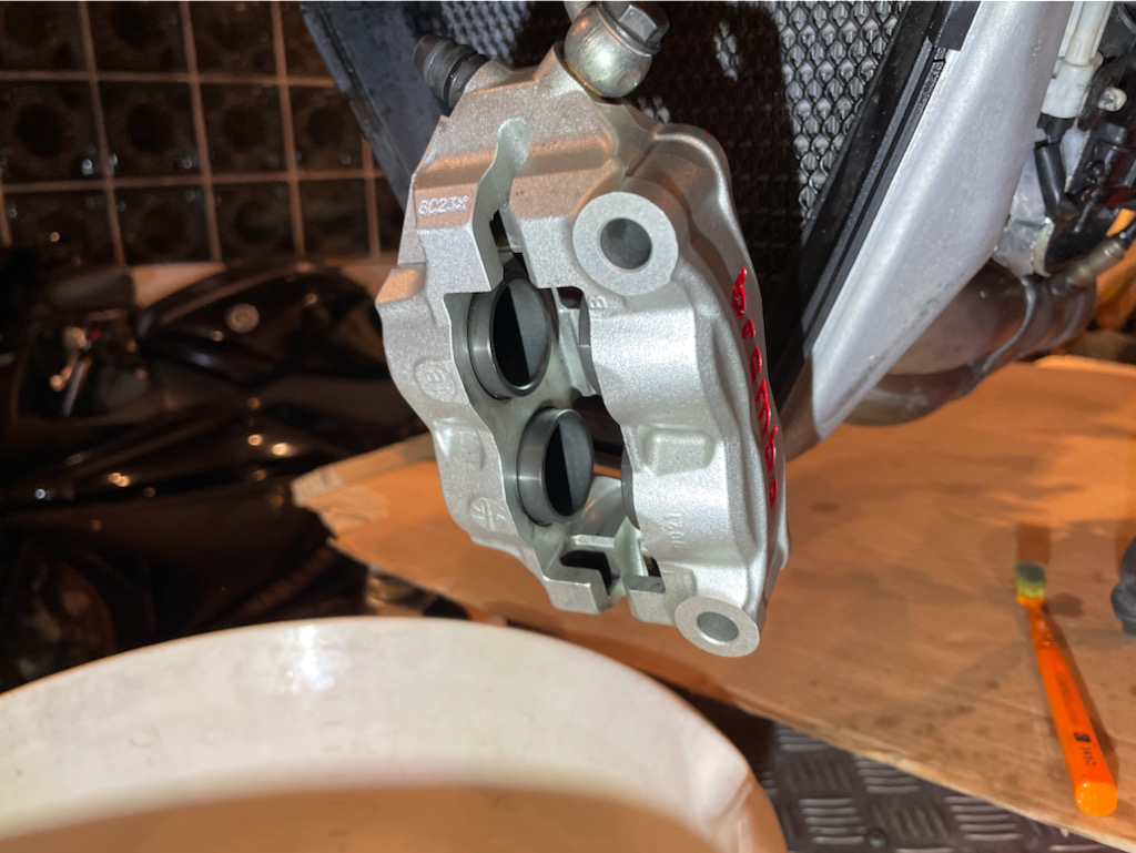 Die Gabel ist eingebaut. Ohne ein störendes Vorderrad kann ich mich gleich den Bremssätteln widmen. Auch hier: wieder kein vorher Bild.