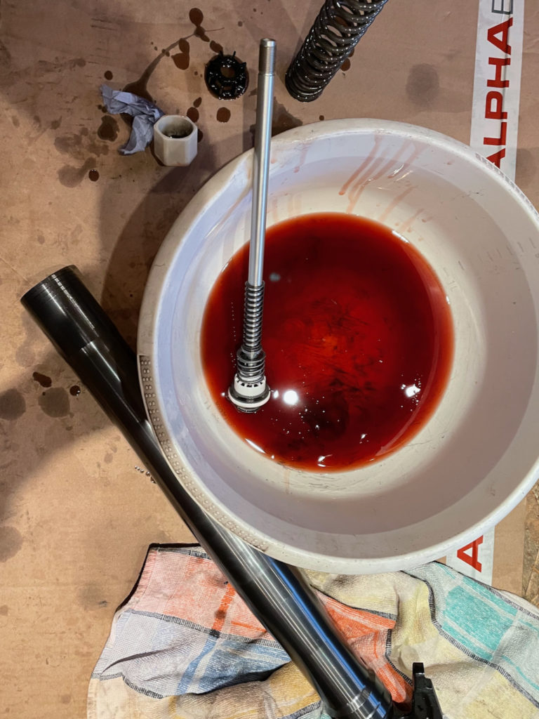Alles auseinander bauen und altes Gabelöl raus. Das sieht schon mal deutlich weniger schlimm aus, als das Öl, was seinerzeit aus der Öhlins Gabel floss.