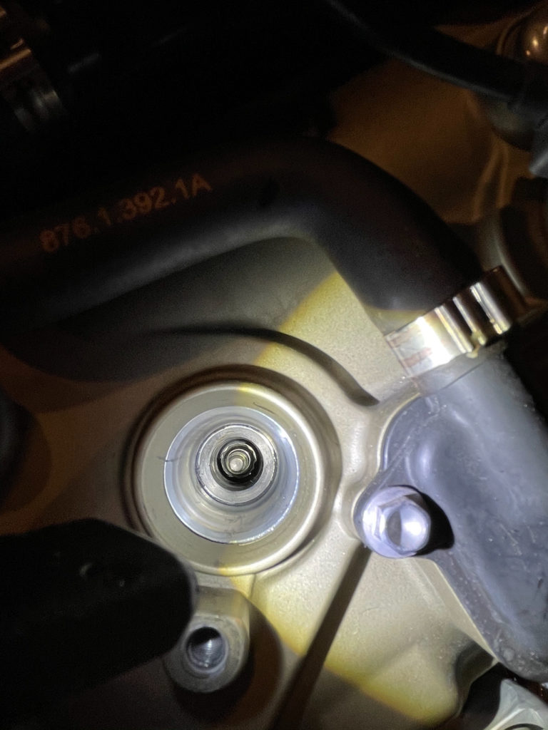 Mit freiem Blick auf die hinteren Zylinder sehe ich, dass die Ventildeckeldichtung schwitz. Also nicht mehr dicht ist. Ein zusätzlicher Blick zu den Zündkerzen zeigt ferner, dass die linke Kerze leicht im Öl steht.