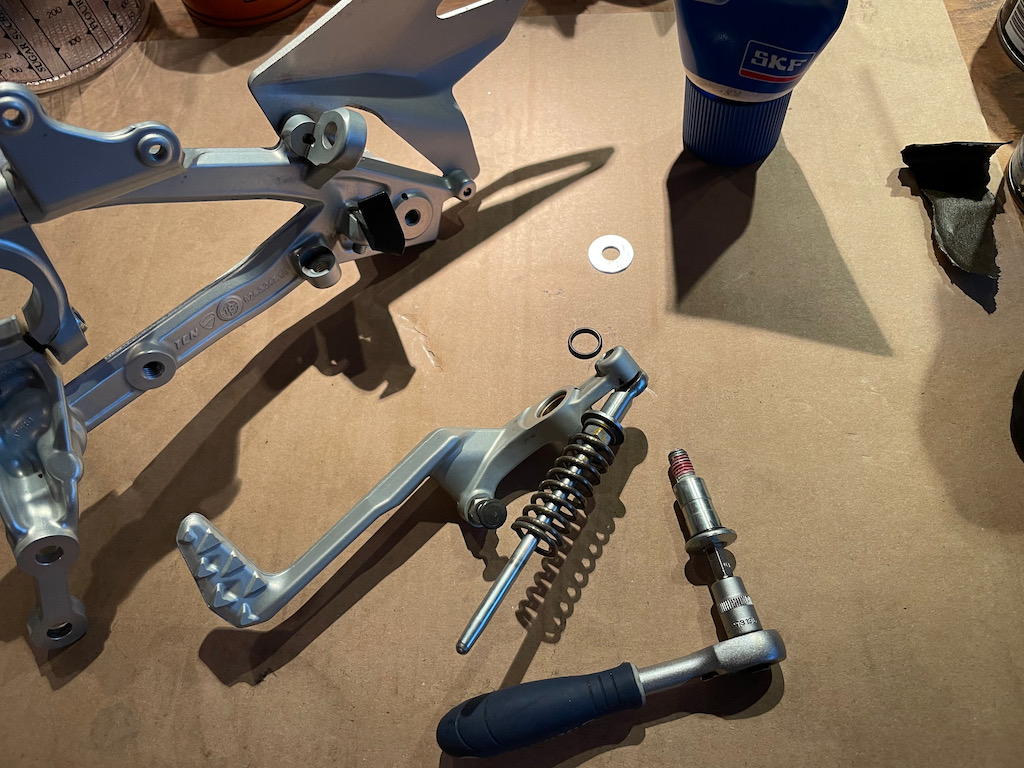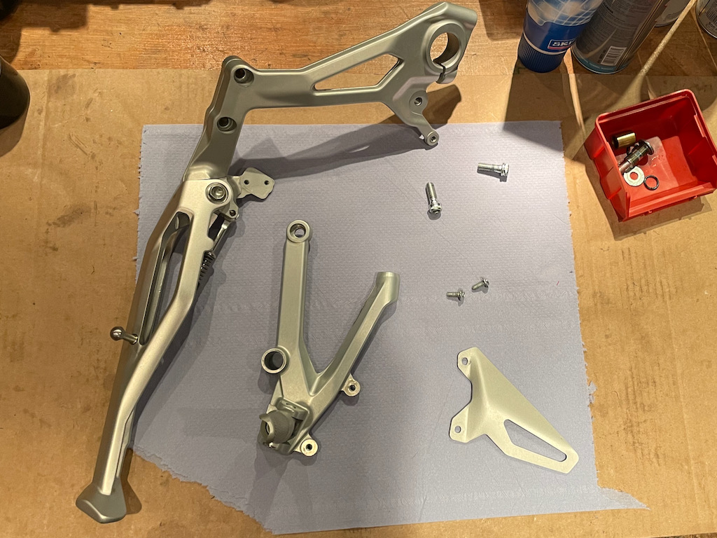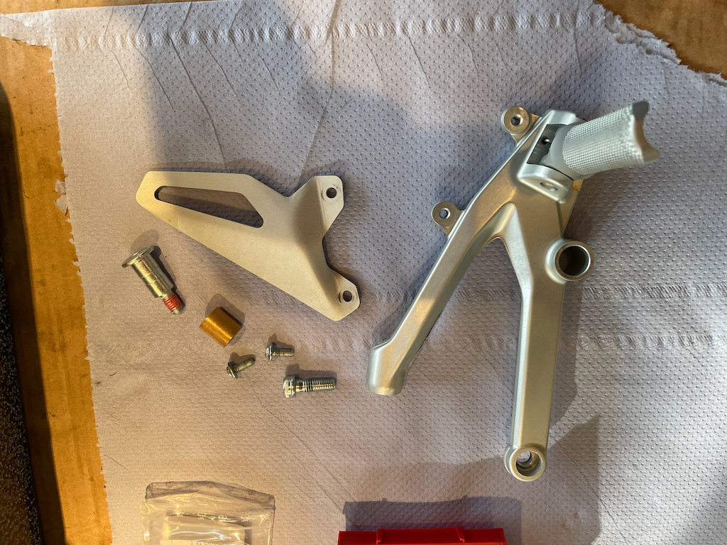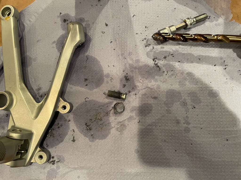 Die originale Rastenanlage passt grundsätzlich für mich. Aktuell ist kein Bedarf für Ersatz. Bei der Überprüfung der Schrauben stelle ich leider fest, dass wieder Pfusch ausgebügelt werden muss einer Schraube des Fussrastenhalters zu viel zugemutet wurden. Schraube ausbohren und ersetzten.