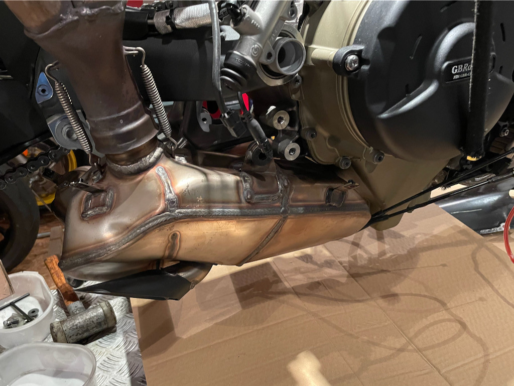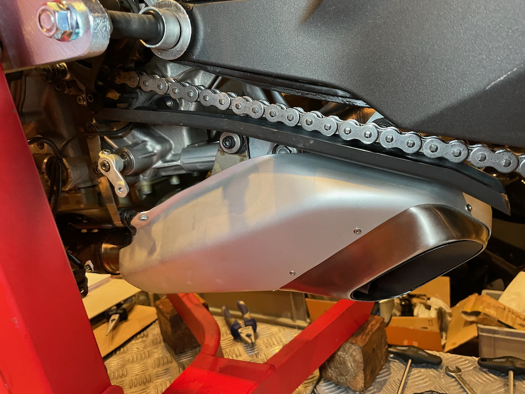 Zuerst müssen die Seilzüge für die Auspuffklappe nach Vorgabe eingestellt werden. Dann kann ich die neuen Auspuffblenden und die rechte Fußrasteneinheit montieren.