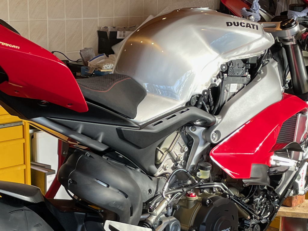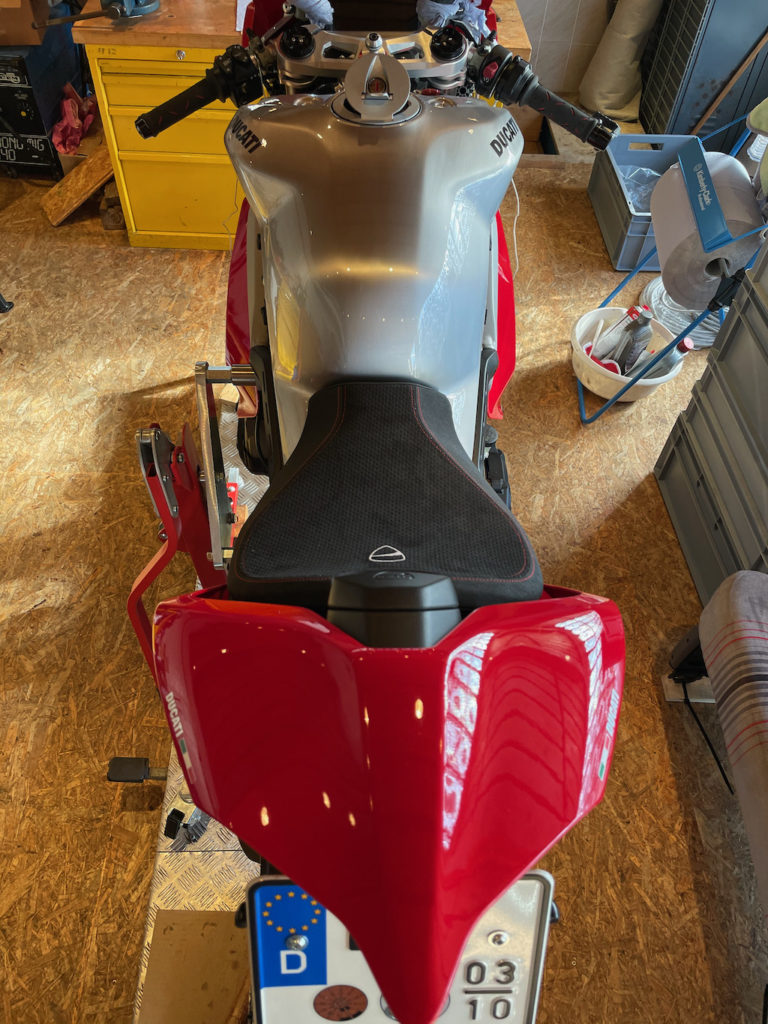 Der Tank wird montiert, alle Leitungen wieder angeschlossen und der Tankdeckel verschraubt. Probehalber bringe ich auch die neue DP Performance Sitzbank an.