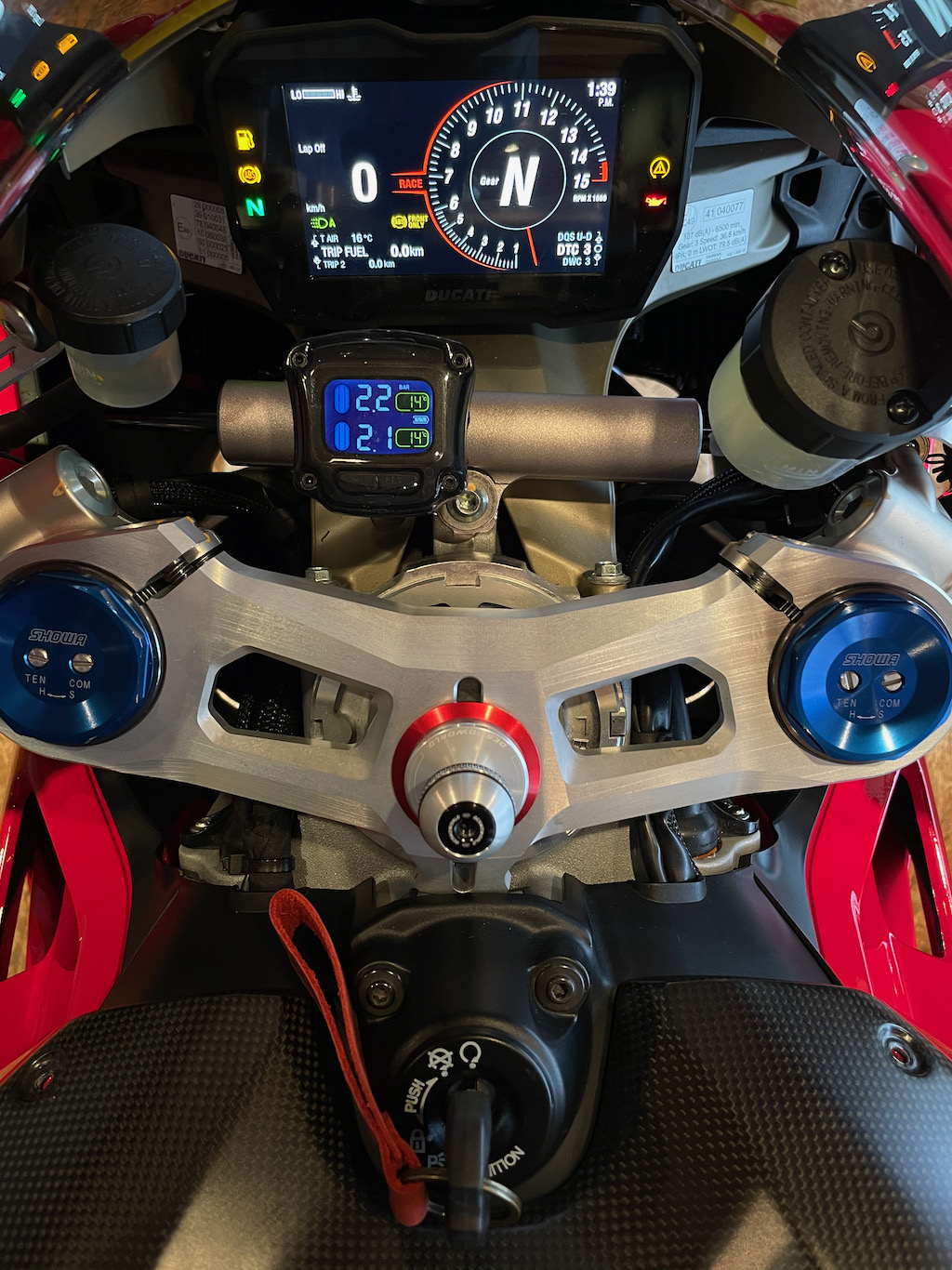 Das Reifendruckkontrollsystem hatte ich bereits an der 1299s und das Display konnte schön zwischen Dash und Scheibe montiert werden. Bei der V4 geht das natürlich nicht.
