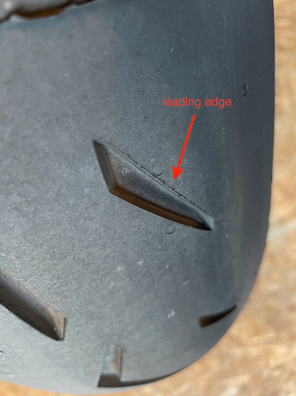 Das Reifenbild zeigt eine erhöhte vordere Kante im Profil. Heißt die Zugstufe ist noch zu stark gedämpft.