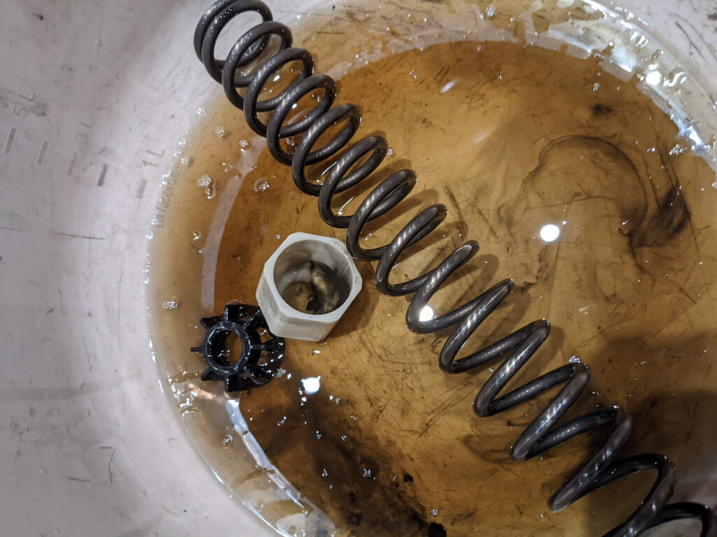 Alles zerlegen, prüfen, spülen/reinigen. Die Führungsbuchsen sind noch gut. Ersetzt werden also jeweils Gabeldichtring und Staubkappe. Genau wie bereits beim letzten Mal.
