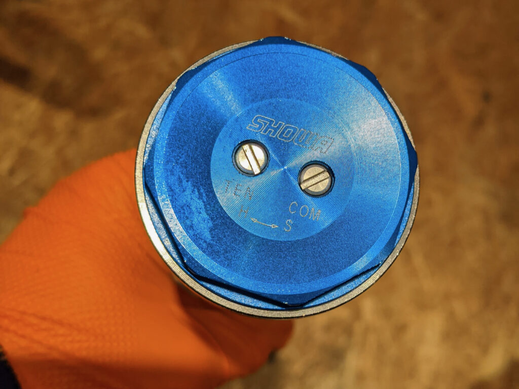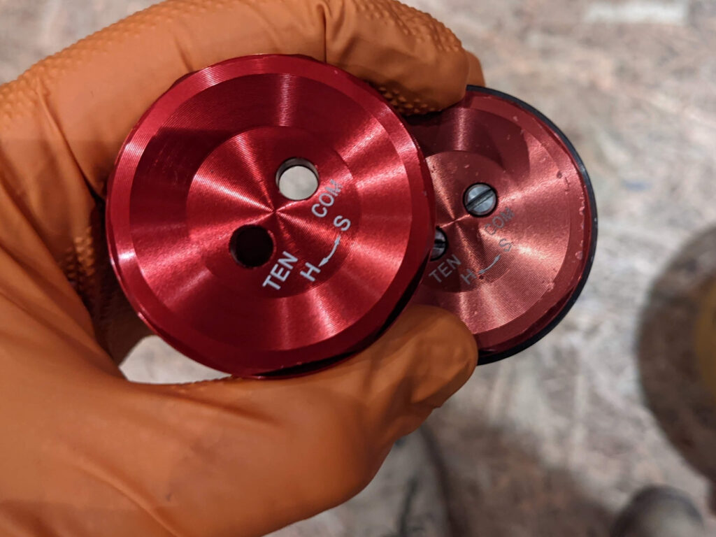 Ferner werden die roten Gabelkappen fürs Erste wieder durch die blauen Showa Kappen ersetzt. Die roten Kappen waren nicht einmal eine Saison im Einsatz und das Rot ist deutlich verblichen. Der Grund ist die mangelhafte Eloxierung. Die noch im Fundus liegenden roten Ersatzkappen kommen in die research and development Kiste.