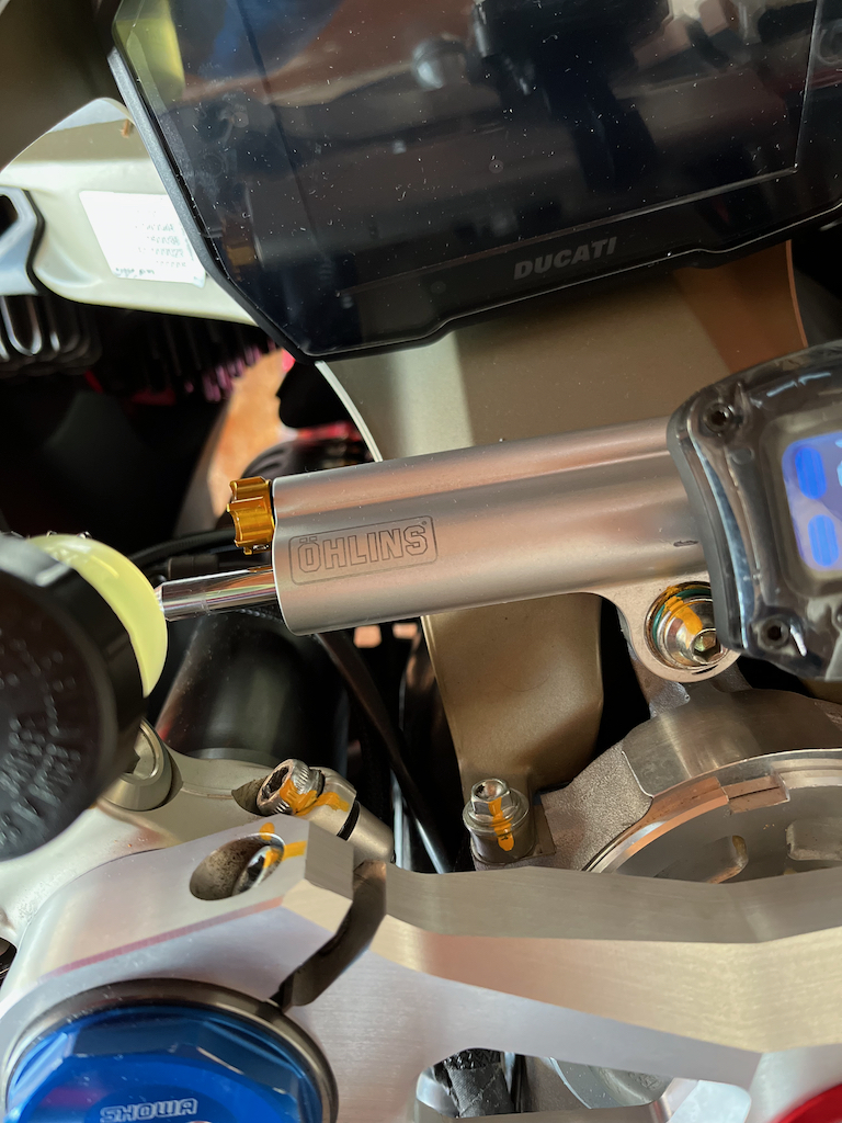 Vorn kommt nun statt des Showa Lenkungsdämpfers einer von Öhlins zum Einsatz. Dieser findet z.B. serienmässig bei der R oder Superleggera Verwendung.