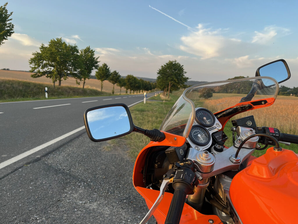 In der zweiten Woche darf auch das japanischen Altmetall ran. Die Idee ist ein soziustaugliches Moped, damit auch der Nachwuchs mit auf Tour kann. Allerdings erreicht auch uns in zweiten Woche die bundesweite Hitzeschlacht. Also mehr Schwimmbad als Moped.