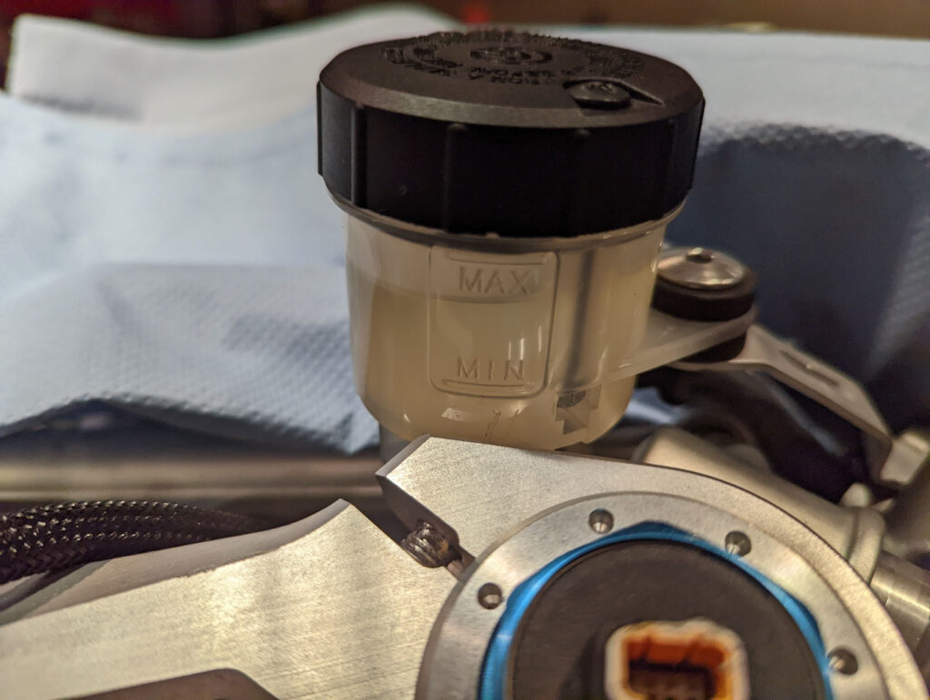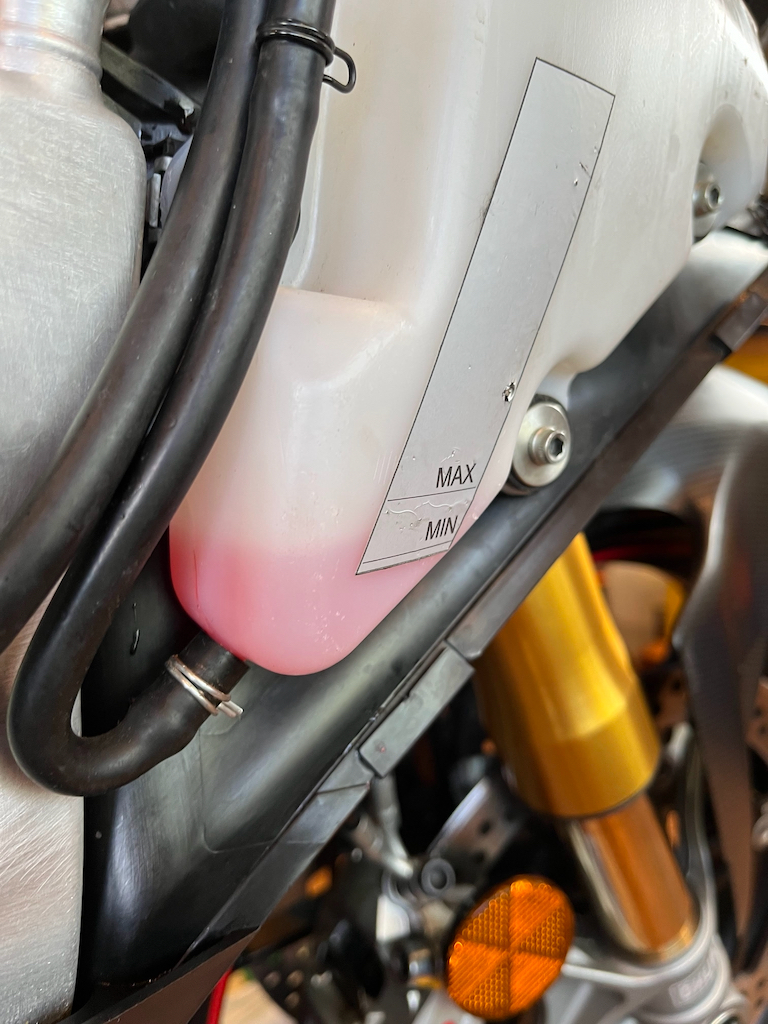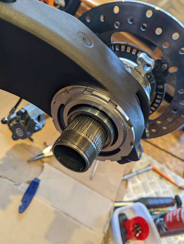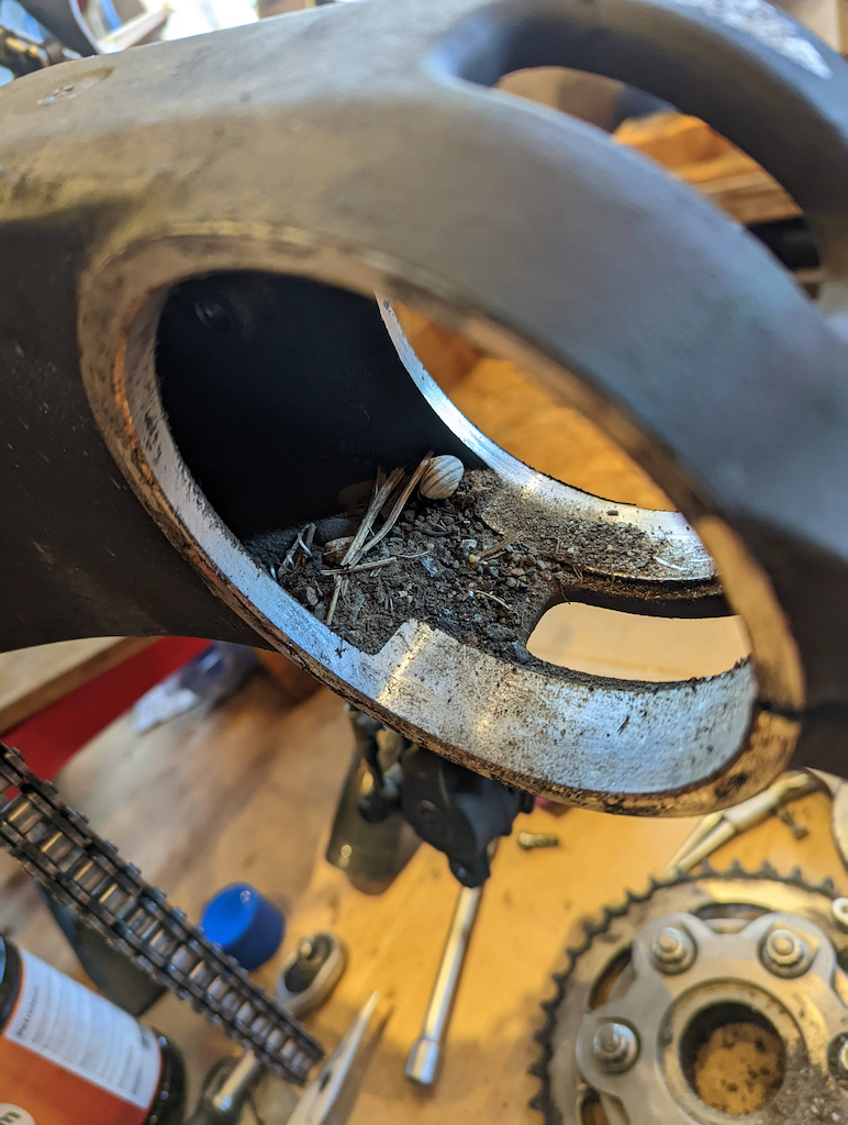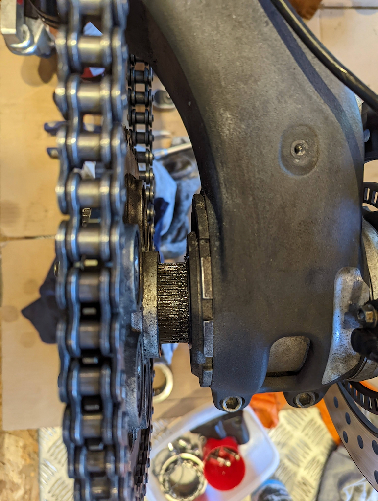 Kette reinigen und den Kettendurchhang einstellen und diversen Pfusch ausgleichen, so fehlten z.B. mehrere Schrauben bei der Krümmerabdeckung. Die hydraulische Kupplungsbetätigung ist voller Luft. Flüssigkeit muss auch getauscht werden.