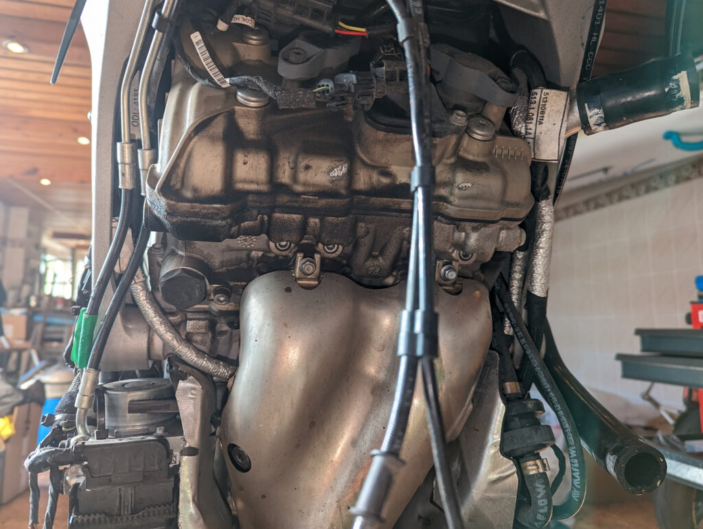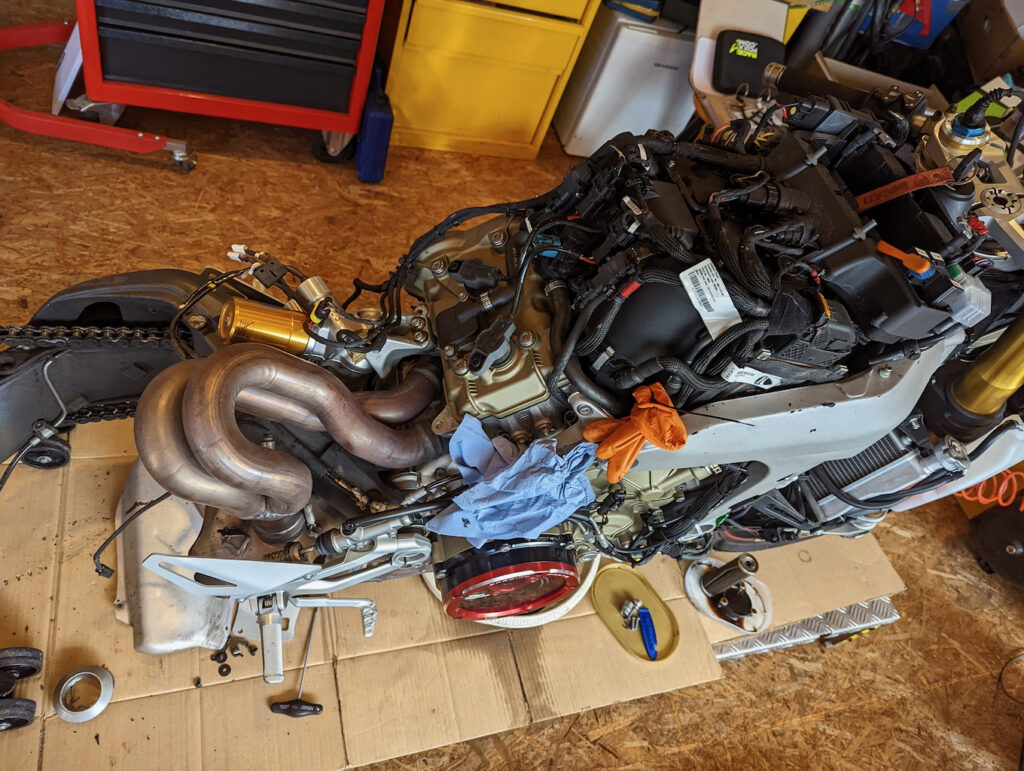 Bei der kurzen Probefahrt die Straße hoch und runter zeigen sich erst einmal keine Auffälligkeiten. Im Display wird, bis auf den überfälligen Service, keine Warnung angezeigt. Der Fehlerspeicher ist hingegen gut gefüllt. Das Ersatzteillager ist durch die V4 ordentlich bestückt und darüber hinaus benötigte Teil sind bereits beschafft. Der Wartung und Pflege steht nichts im Weg. Rauf auf die Bühne und Verkleidung runter.