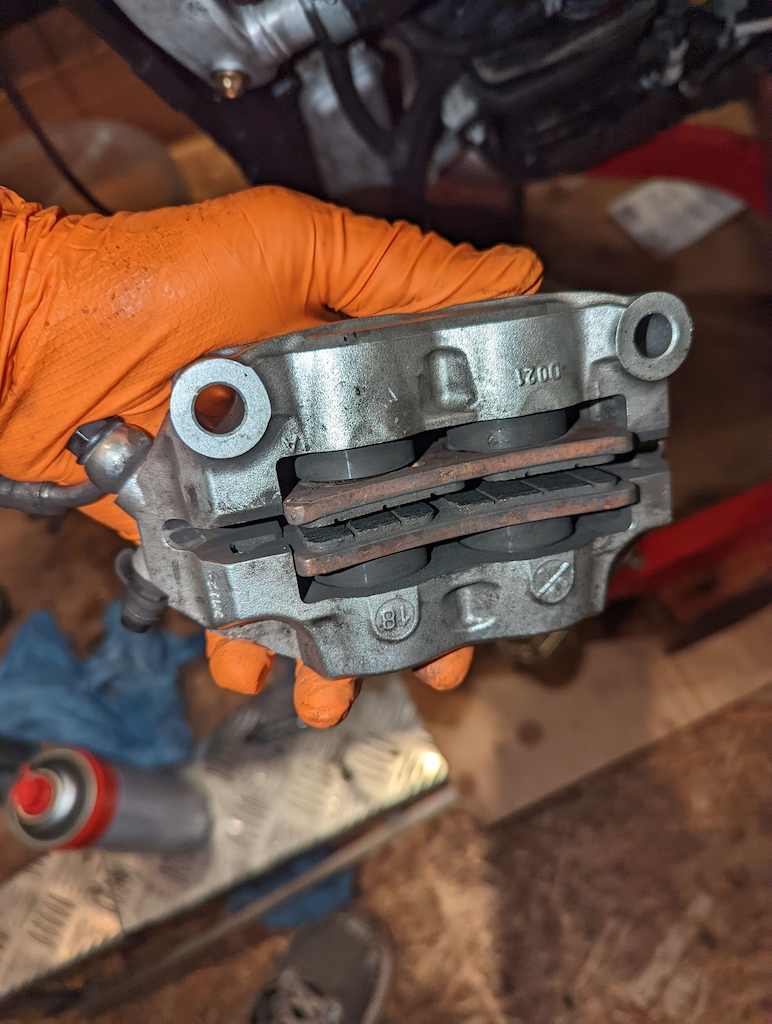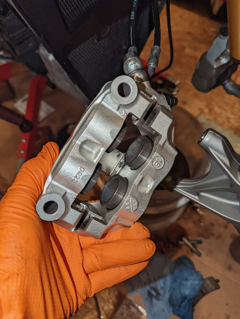 Dazu immer und überall: Putzen und Reinigen. Die Bremssättel sehen aus, als wenn sie noch nie gereinigt wurden. Die Gabel sieht auch nicht besser aus.