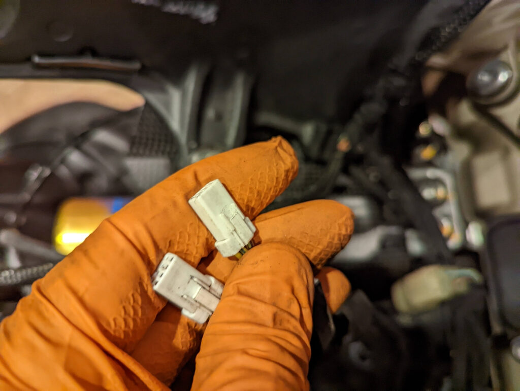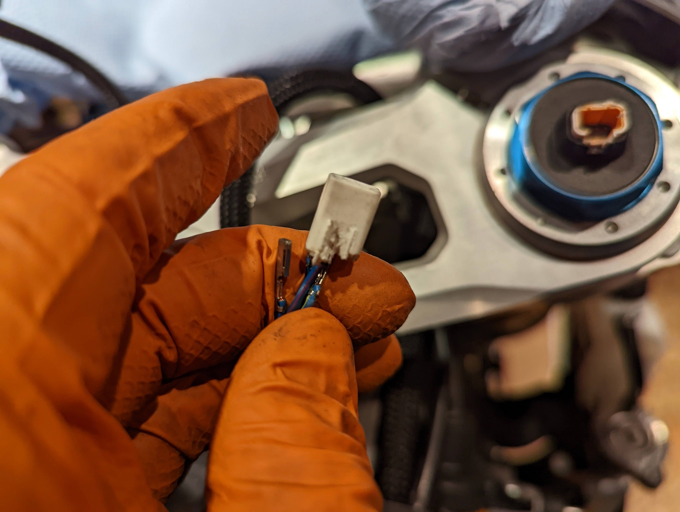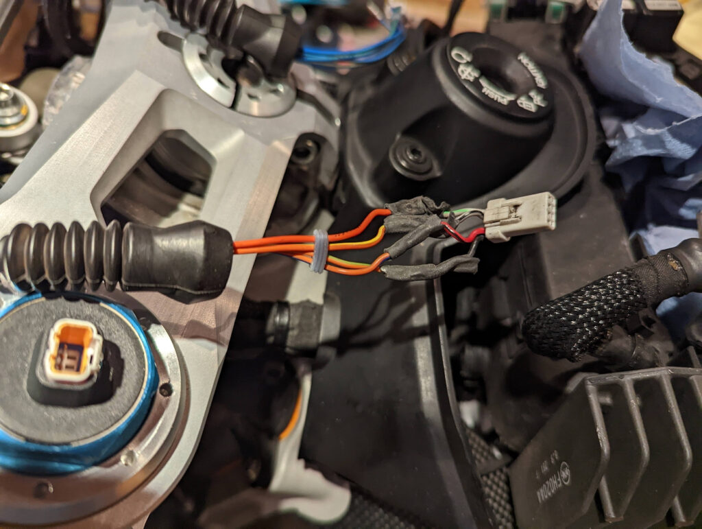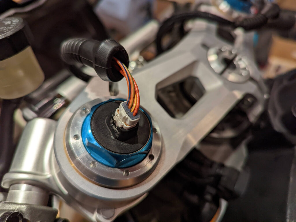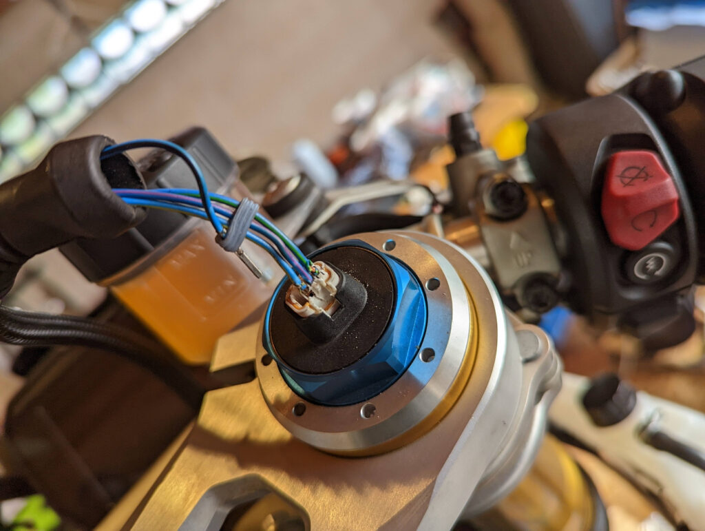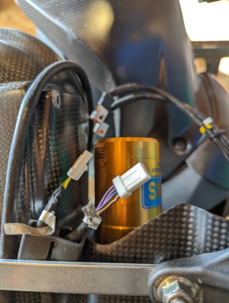 Alle(!) Stecker für die elektrische Ansteuerung der Dämpfungselemente von Gabel und Stoßdämpfers sind beschädigt. Die Sicherungslasche ist abgebrochen. Bei der Heckbeleuchtung das gleiche Bild.