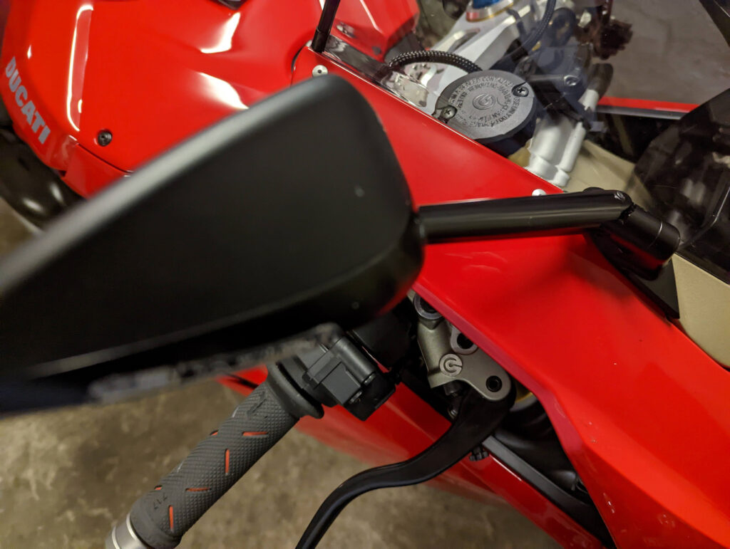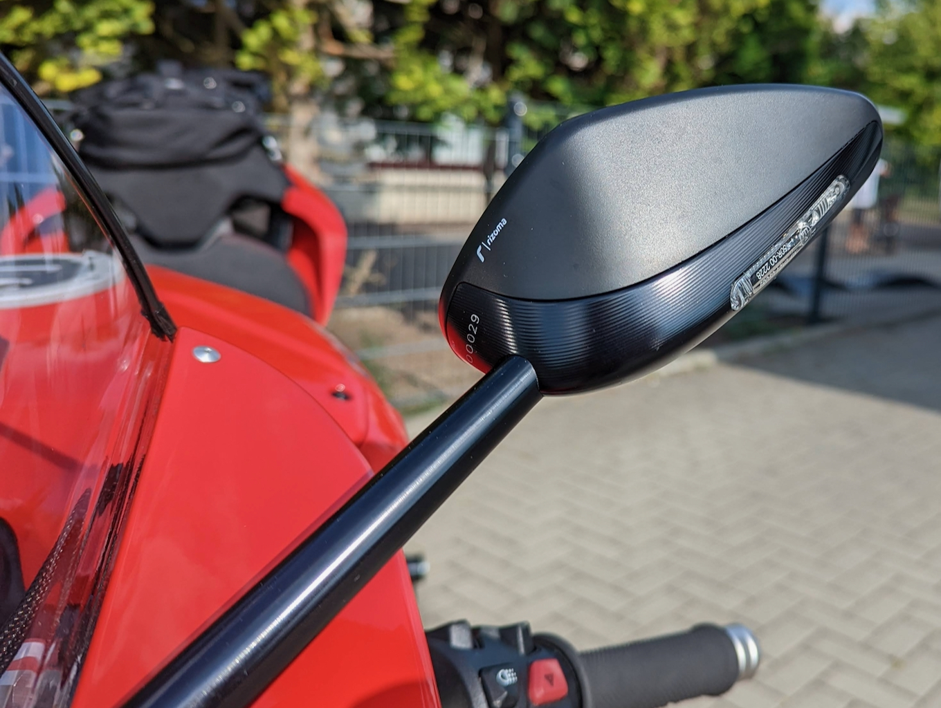 Die Panigale V4S kommt mit Rizoma Veloce L Sport Spiegeln. Montiert wurden diese ebenfalls durch eine Fachwerkstatt. Natürlich muss hier nachgebessert werden.