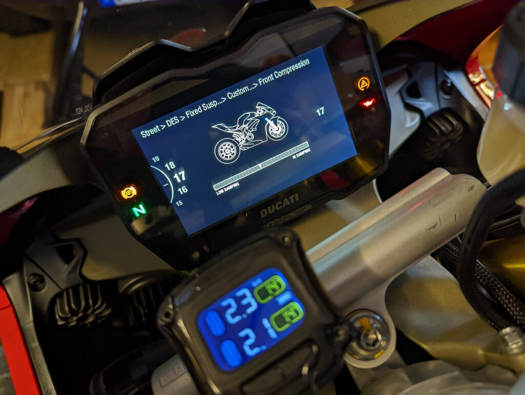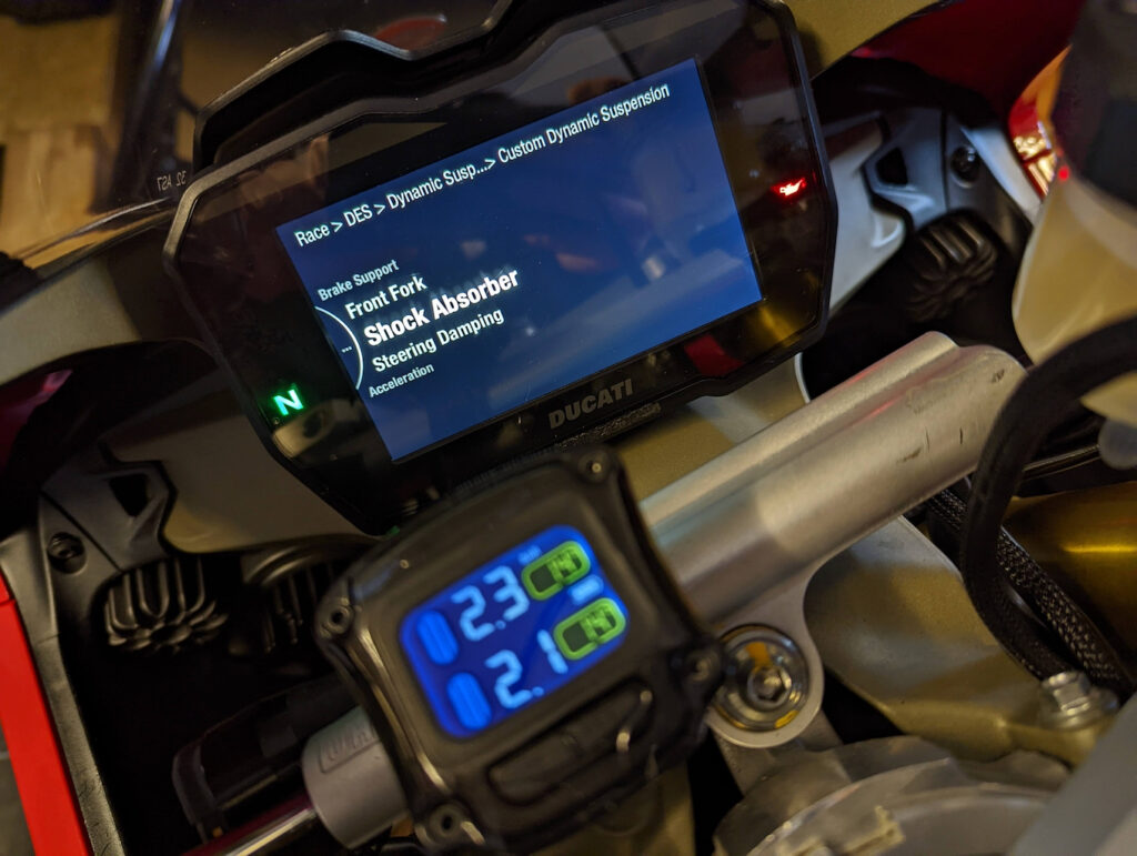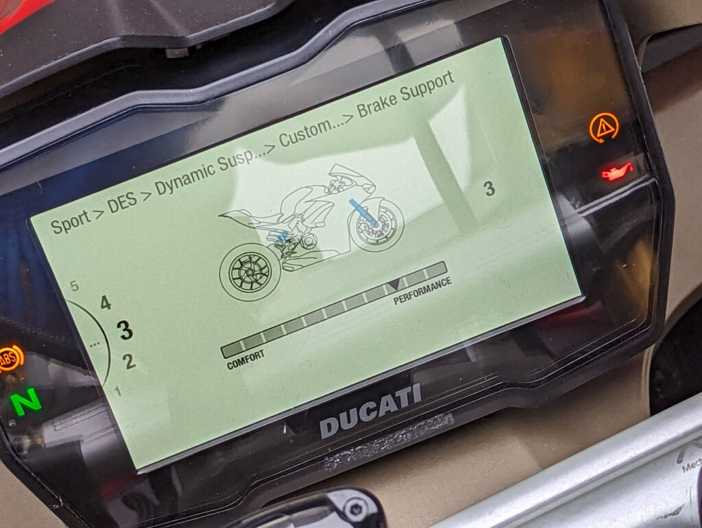 Die 1299 S kann im dynamische Modus auf fünf verschiedene Dämpfungseinstellungen, von ganz weich bis ganz hart, angepasst, also personalisiert werden. Oder, wenn man es auf die Einstellungsmöglichkeiten der V4S adaptiert, von -2 bis +2. Diese Personalisierung ist für die Gabel, das Federbein und den Lenkungsdämpfer im jeweiligen Modus möglich. Das hat für mich schon sehr gut funktioniert.