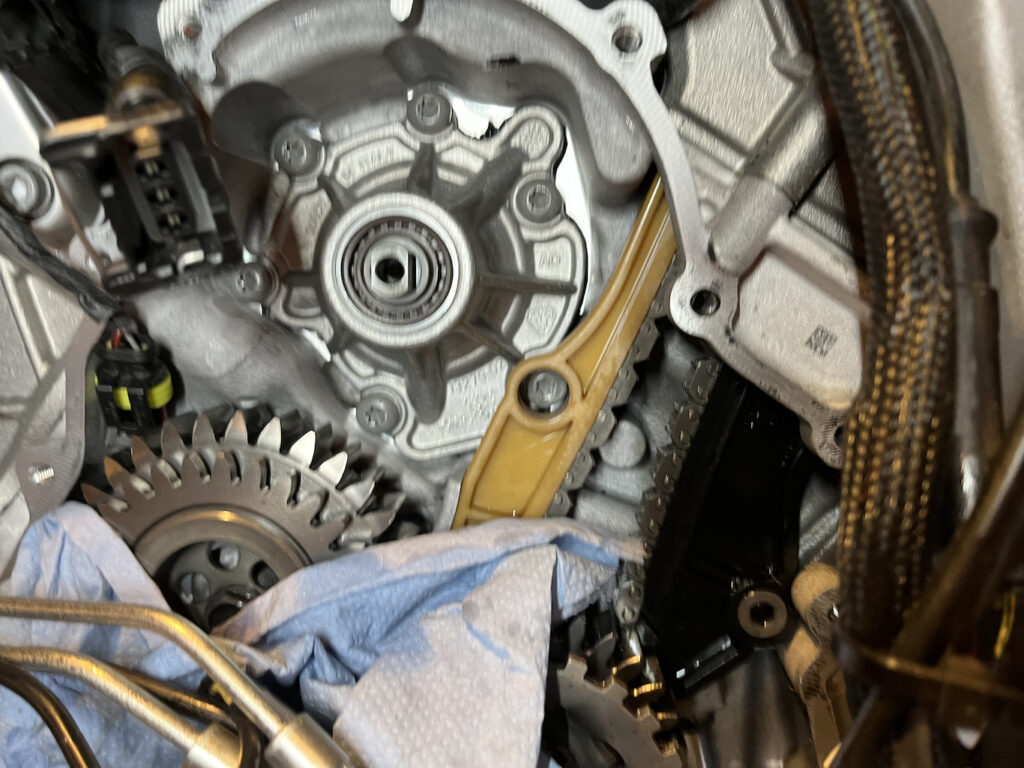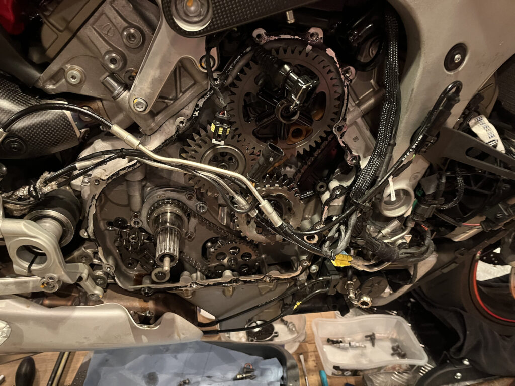 Eine Schwachstelle bei der Panigale V4 ist, wie man in vielen Eintragungen in diversen Foren lesen kann, die Wasserpumpe. Das übliche Fehlerbild ist Ölaustritt zwischen den beiden Zylinderbänken. Meine V4 hatte das glücklicherweise nicht.