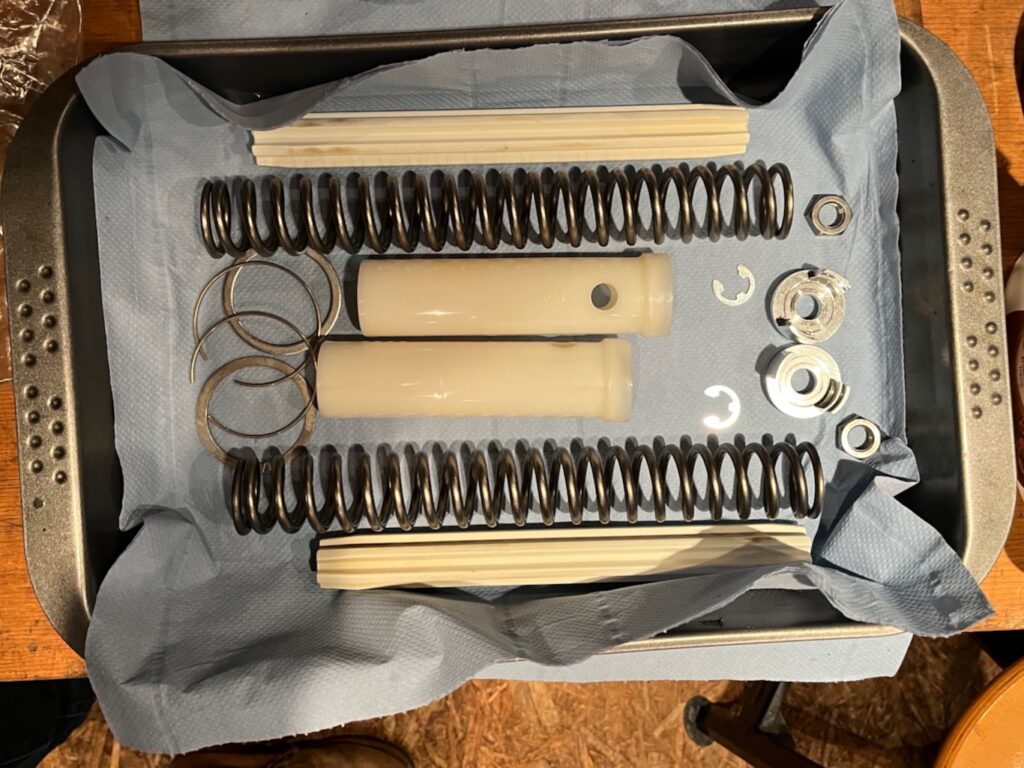 Im Zuge der notwendigen Wartung der Gabel werden die Federn getauscht. Zuvor ist werden die Gabelholme ausgebaut, zerlegt und gereinigt.
