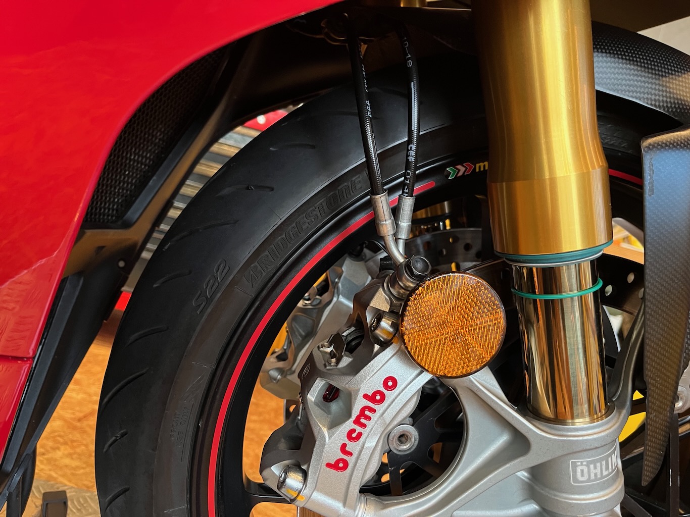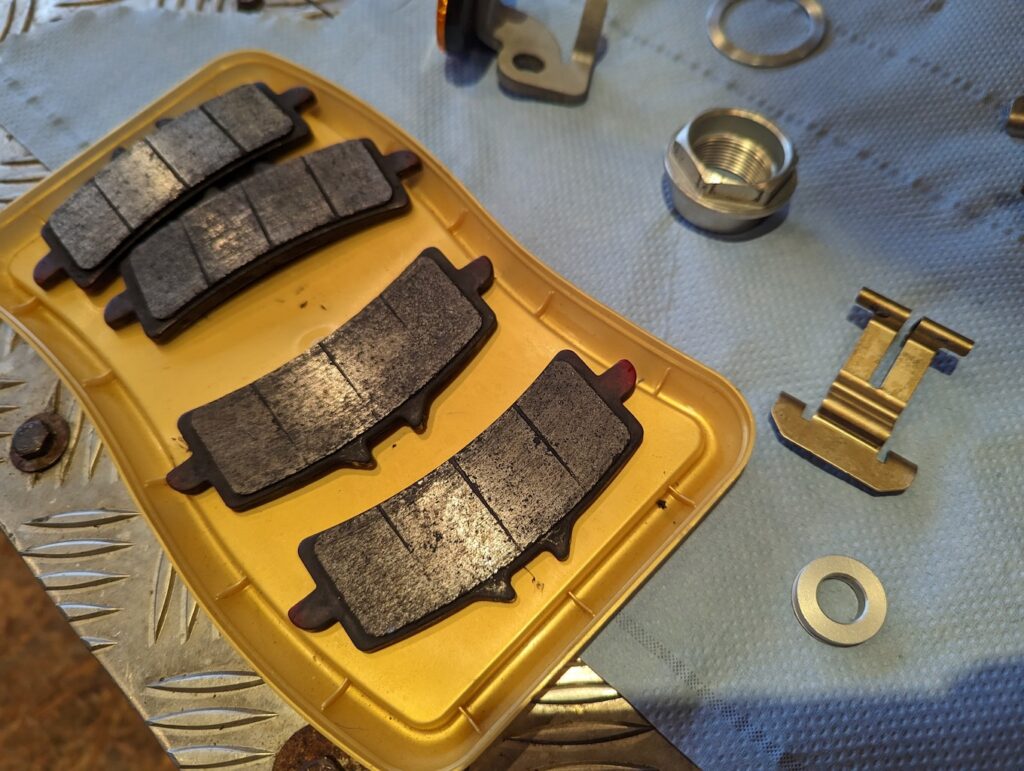 Die Gabel ist eingebaut. Weiter geht es mit Vorderrad und Bremse. Die Bremsbeläge sind fällig, neue liegen schon bereit.