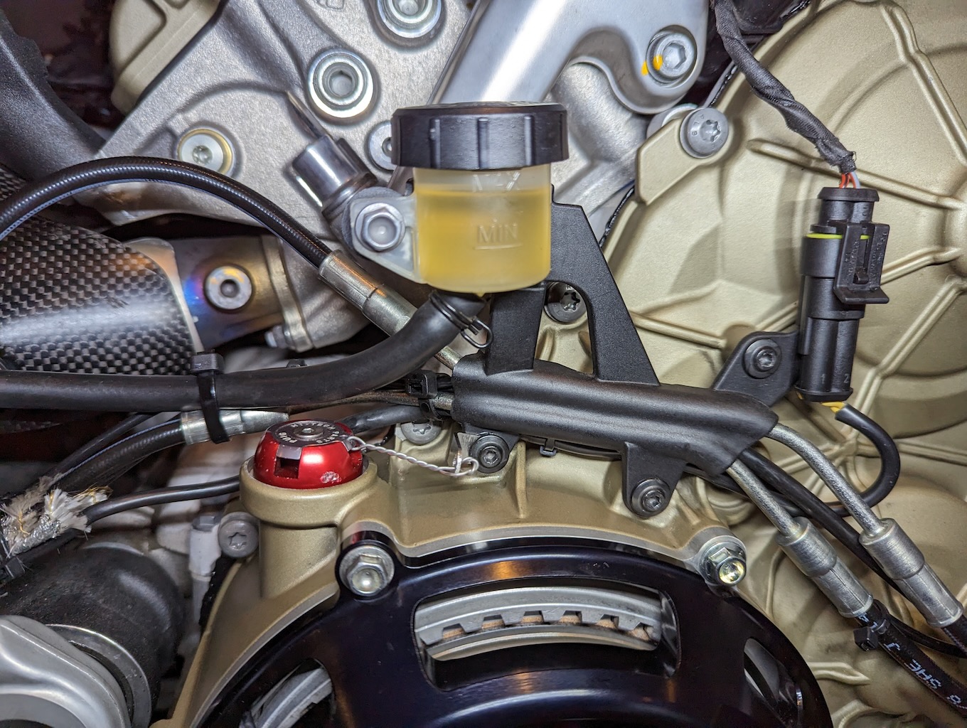 Das Federbein ist zum Service. Zeit einige Aufgaben der to do Listen abzuarbeiten. Zum einen ist die Bremsflüssigkeit der Hinterrad Bremse jetzt auch getauscht. Darüber hinaus ein Scottoiler montiert.