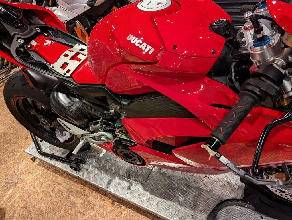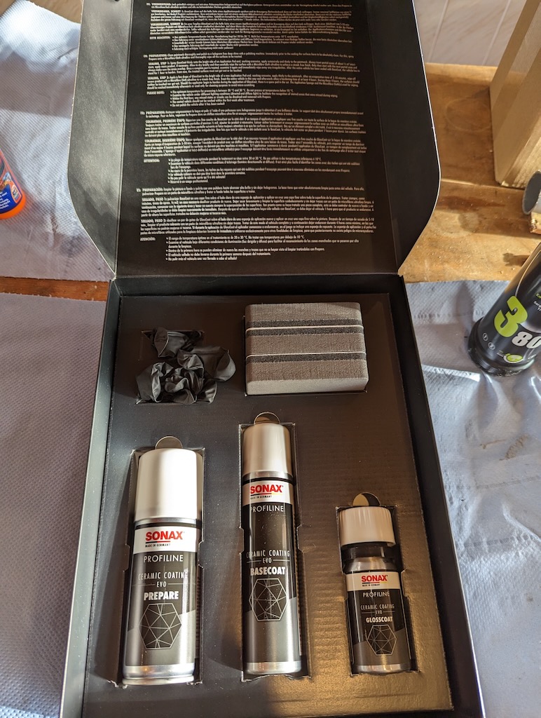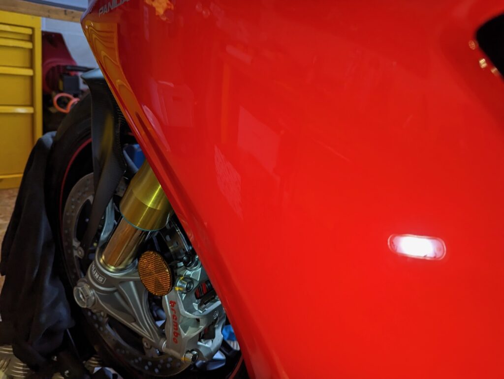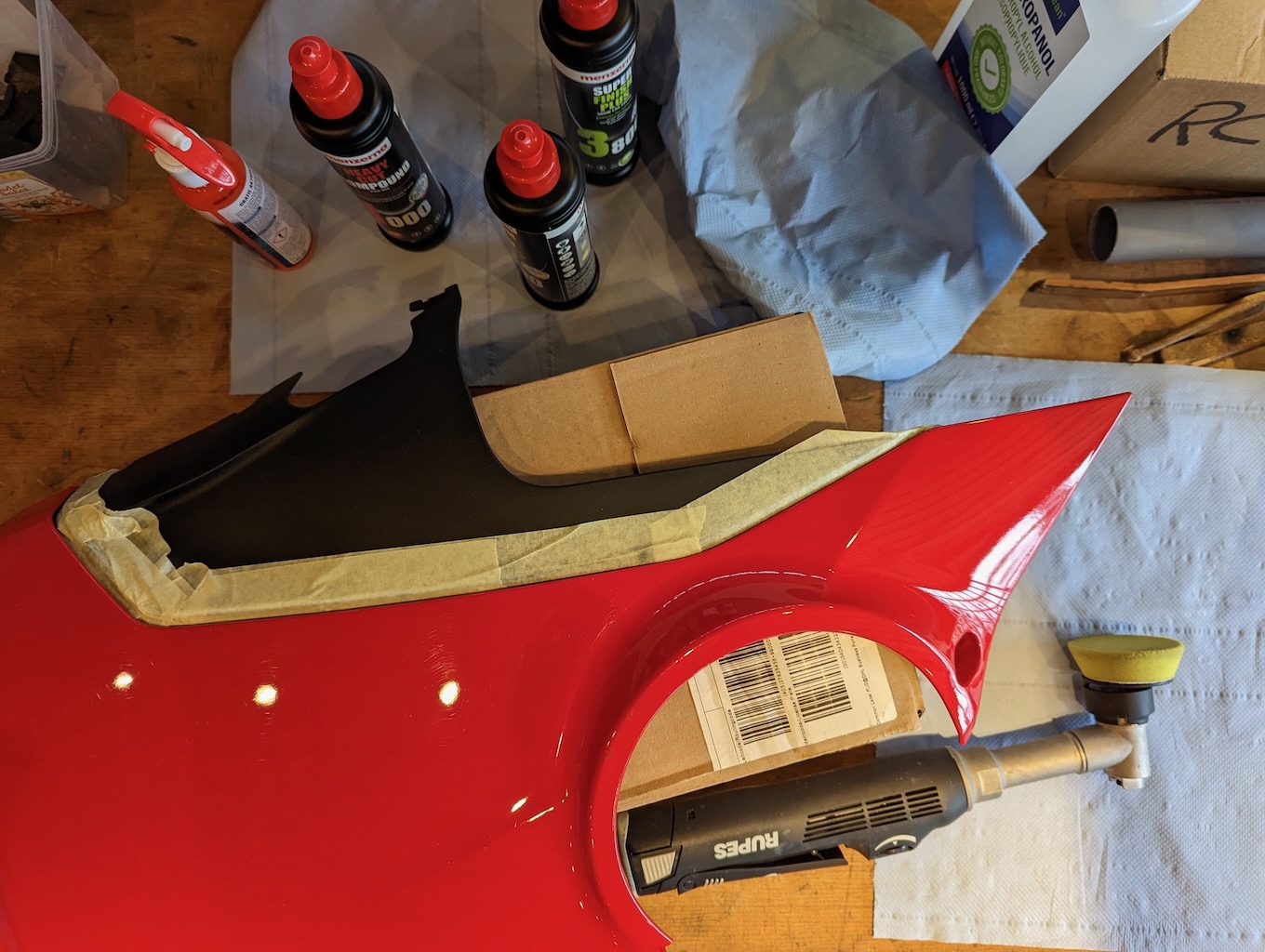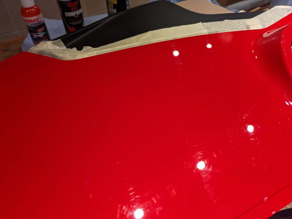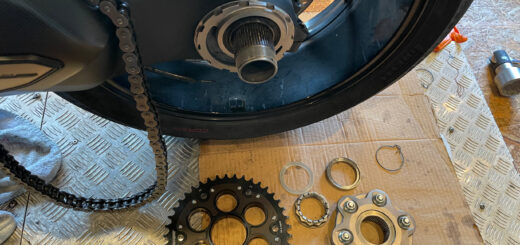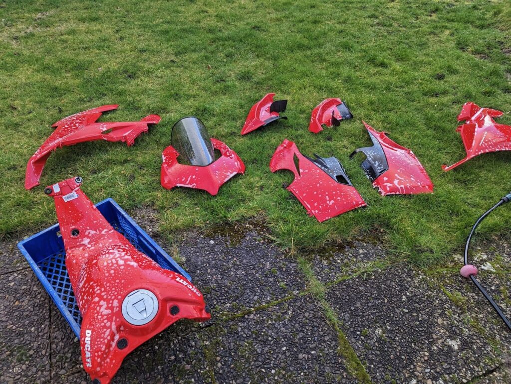 Wenn ich schon einmal dabei bin, werden die lackierten Teile mit einer Keramik Versiegelung behandelt. Die Hoffnung ist, dass die Verkleidung des Motorrads beim Transport auf dem Trailer durch den Regen, was in den letzten Jahren immer mal wieder passiert ist, auf Grund der Versiegelung „sauber“ bleibt. Es wird sich zeigen, ob die Erwartung erfüllt wird.