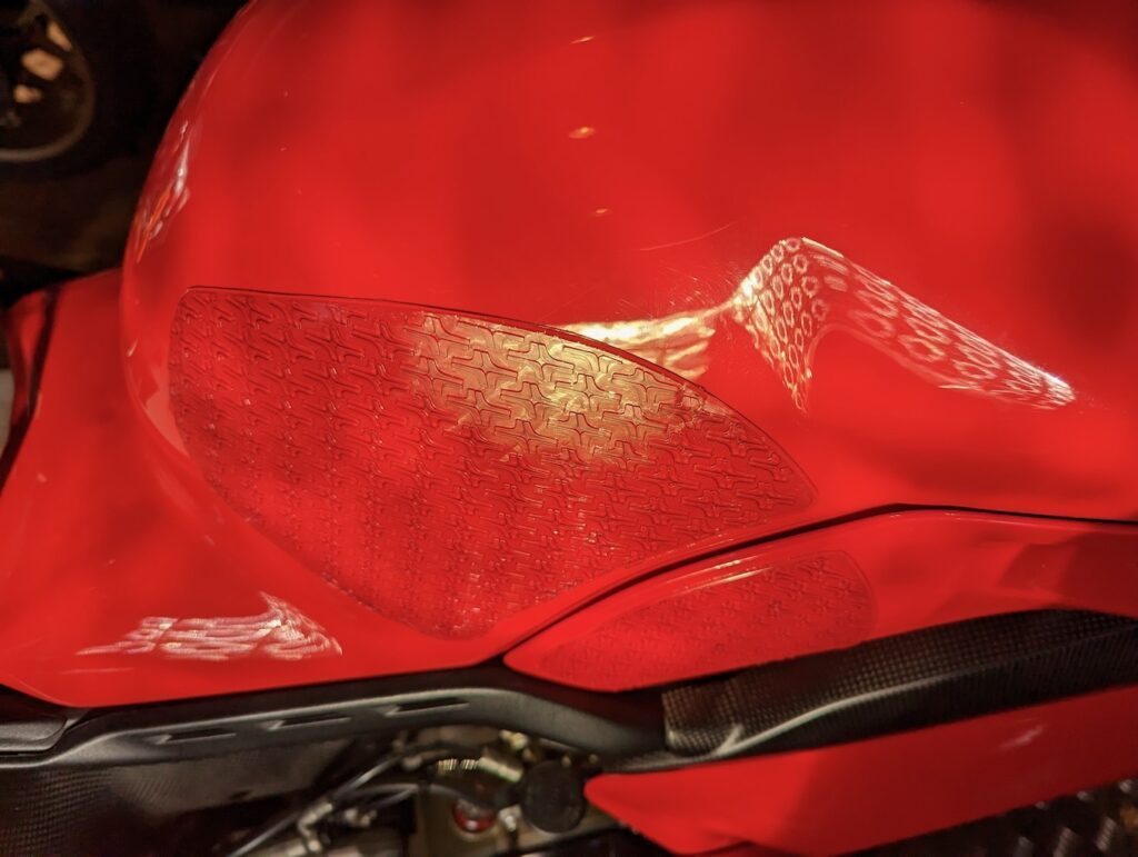 Nach der Montage des Tanks und der Verkleidung werden die Teile entfettet. Zuerst werden die unvermeidbaren Tankpads von Stompgrip verklebt. Schön finde ich sie nicht, aber ohne ist ein Abstützen am Tank nicht möglich. Für die Straße kommt dieses Mal die gemässigte ICON Design Variante zum Einsatz.