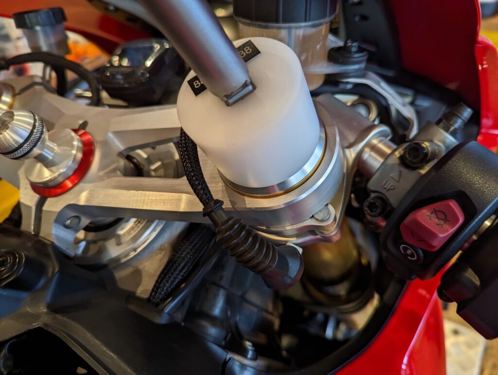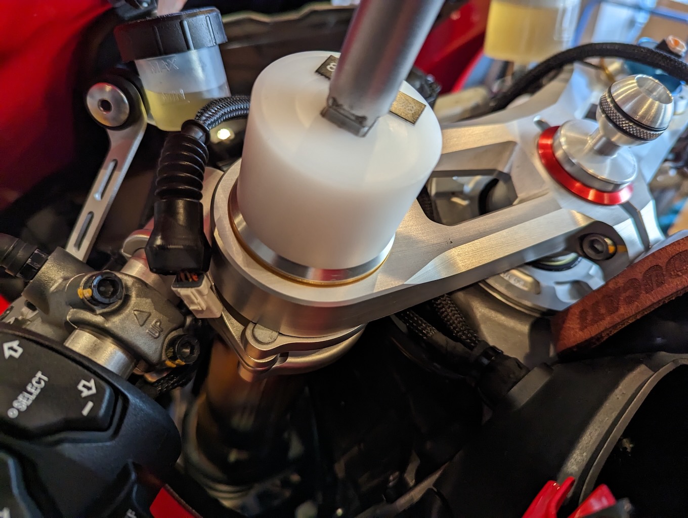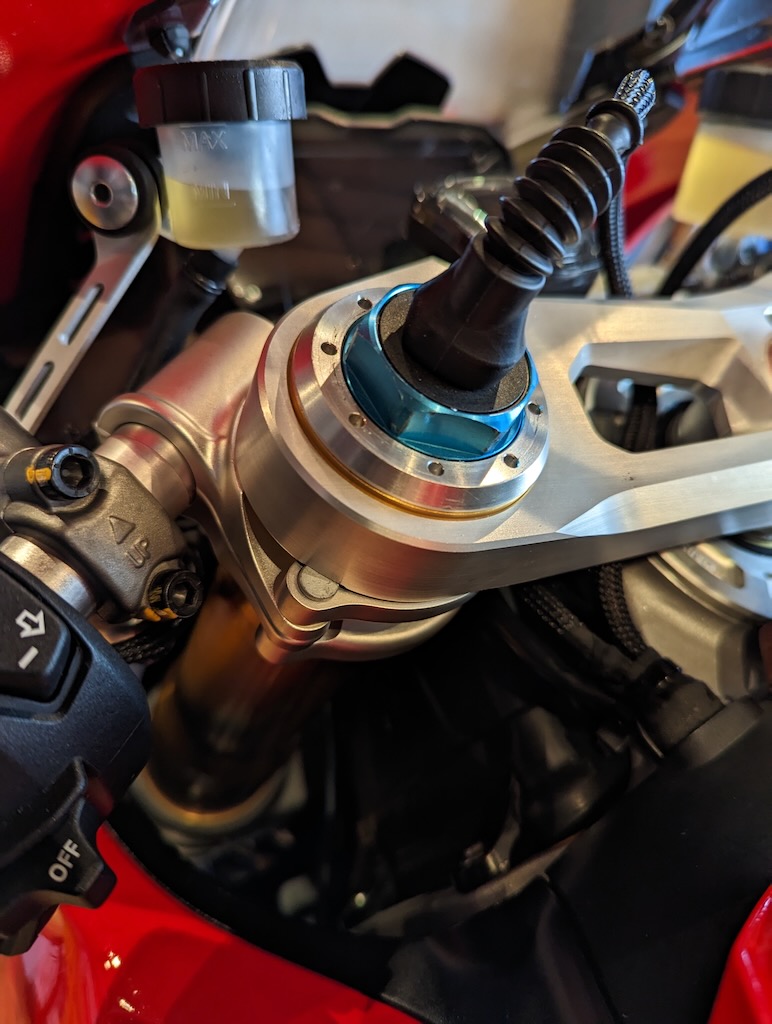 Mit dem richtigen Werkzeug geht das auch ohne Beschädigung der veredelten Oberflächen. Leider war auch bei dieser Panigale bereits ein Profi am Werk und hat die eloxierte Oberfläche der Verstellung beschädigt.