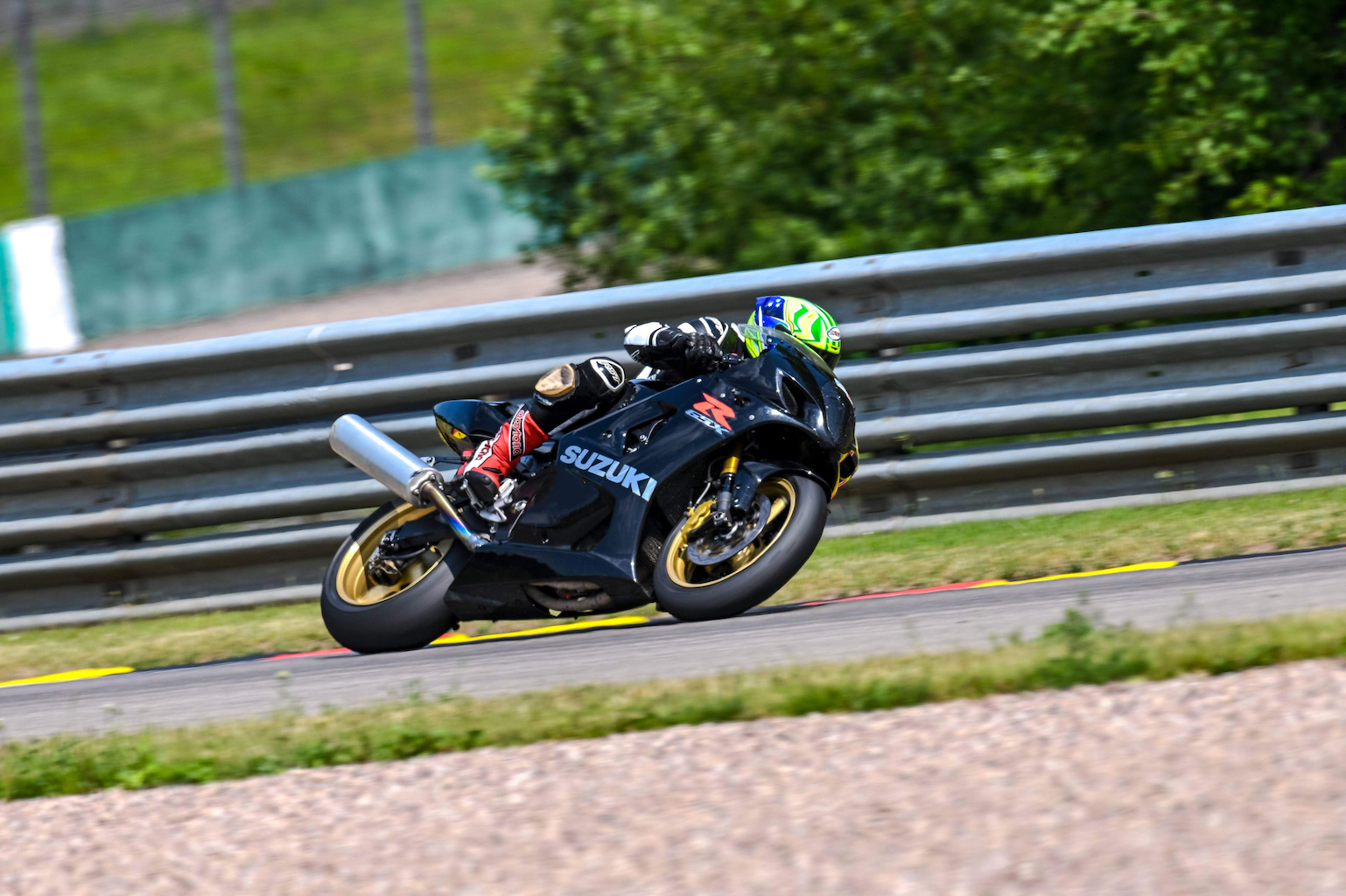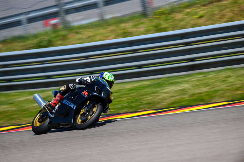 Die GSXR 1000 K4, also ein im Grunde 20 Jahre altes Motorrad, fährt sich prima. Einzig, dass die Suzuki nach meinem Empfinden in diesem Serienzustand etwas schwer um die Ecke geht. Die Besitzerin der K4 berichtet, dass sie das ebenso empfindet. Also wird eine Geometrie Anpassung auf die ToDo Liste geschrieben.