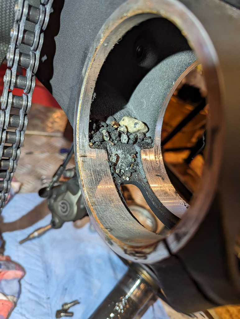Das Ausbauen und die Kontrolle der Hinterachse und des Exzenters und der darin laufenden Lager erst mit dem Desmoservice, also kilometerabhängig, ist m.E. grundsätzlich zu spät. So auch hier.