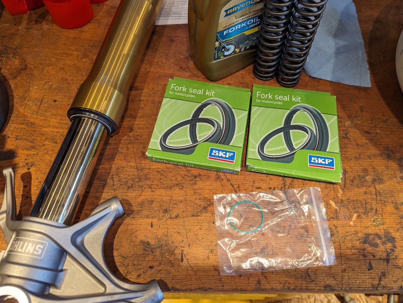 Die Gabel wird gespült um den Abrieb und die Reste des alten Gabelöls zu entfernen. Neue SKF Dichtringe werden montiert. Ferner ein O Ring als Hub Indikator.